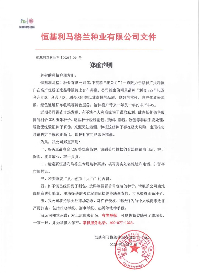 3月6日,恒基利马格兰种业有限公司(下称“恒基利马格兰”)发布声明称,近期公司调查市场发现,有不法个人和商家为了谋取私利,肆意低价销售假冒的利合328玉米种子。这些种子经过割包、烫码、套包、散包等非法手段处理,导致无法验证种子真伪,来源无法追溯,种植这些种子存在极大风险,出现损失时销售方早就远走高飞,即使打官司也未必能赢。