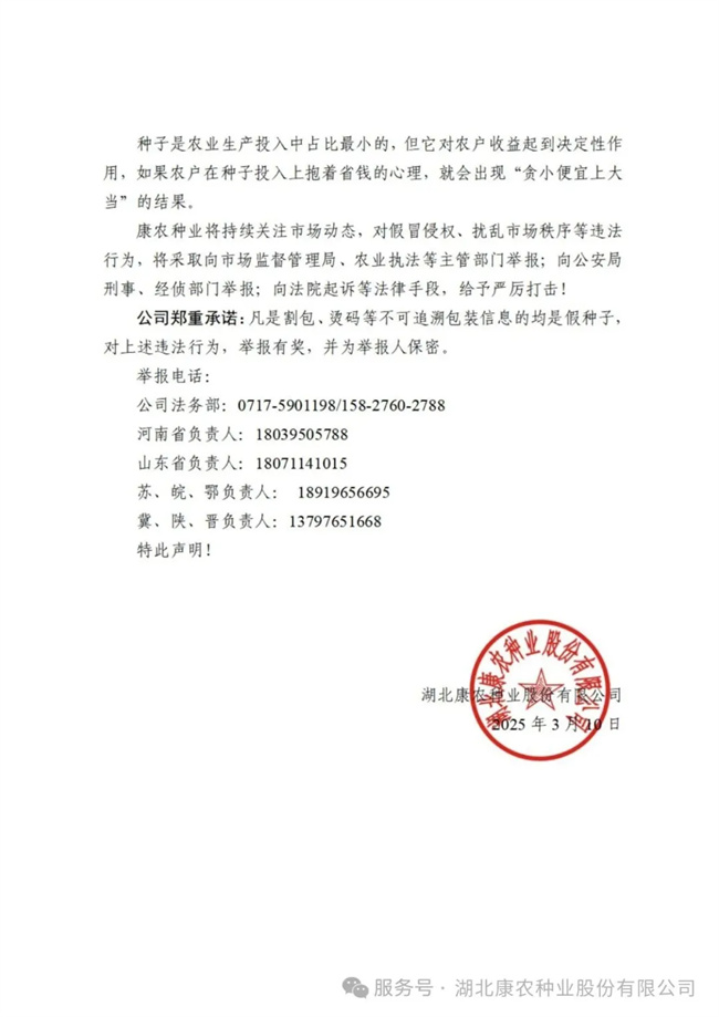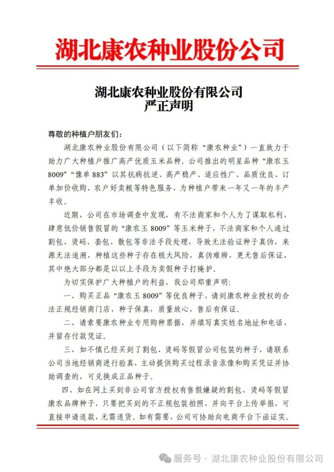 无独有偶,3月10日,湖北康农种业股份有限公司(下称“湖北康农”)在市场调查中发现,有不法商家和个人为了谋取私利,肆意低价销售假冒的康农玉8009等玉米种子,不法商家和个人通过割包、烫码、套包、散包等非法手段处理,导致无法验证种子真伪,来源无法追溯,种植这些种子存在极大风险,真伪难辨,更无售后保证,其中绝大部分都是以以上手段为卖假种子打掩护。