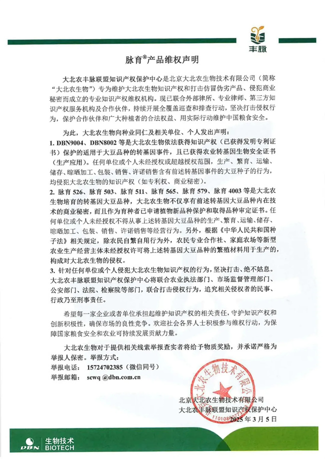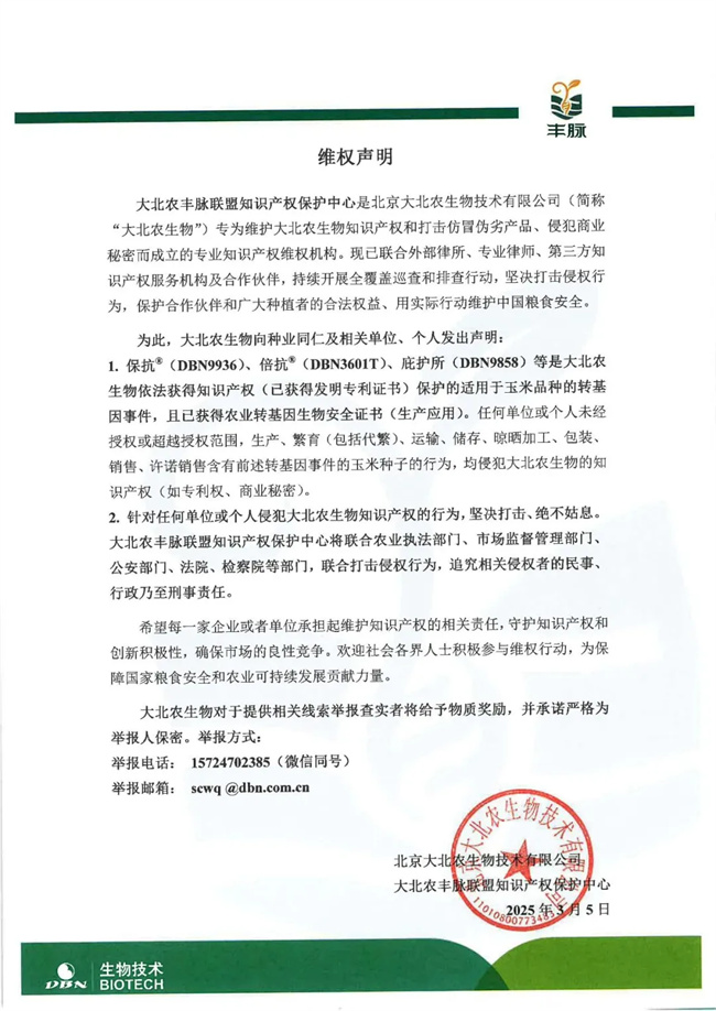 3月5日,北京大北农生物技术有限公司(下称“大北农生物”)专为维护大北农生物知识产权和打击仿冒伪劣产品发布维权说明。