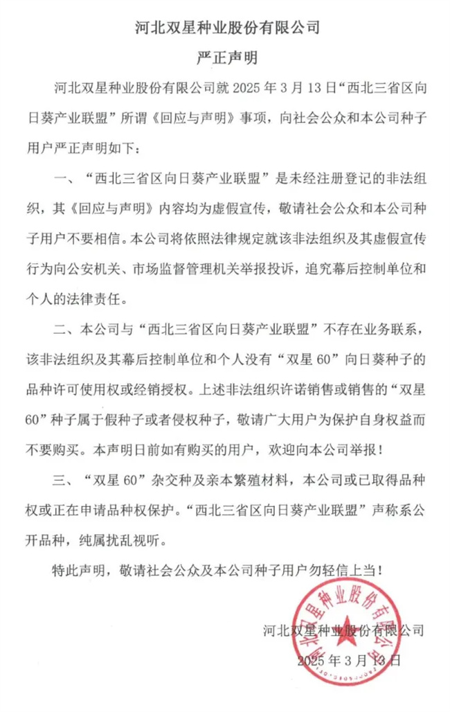 此外,河北双星种业股份有限公司(下称“河北双星种业”)先发布声明,称公司与“西北三省区向日葵产业联盟”不存在业务联系该非法组织及其幕后控制单位和个人没有“双星60”向日葵种子的品种许可使用权或经销授权。上述非法组织许诺销售或销售的“双星60”种子属于假种子或者侵权种子,敬请广大用户为保护自身权益而不要购买。