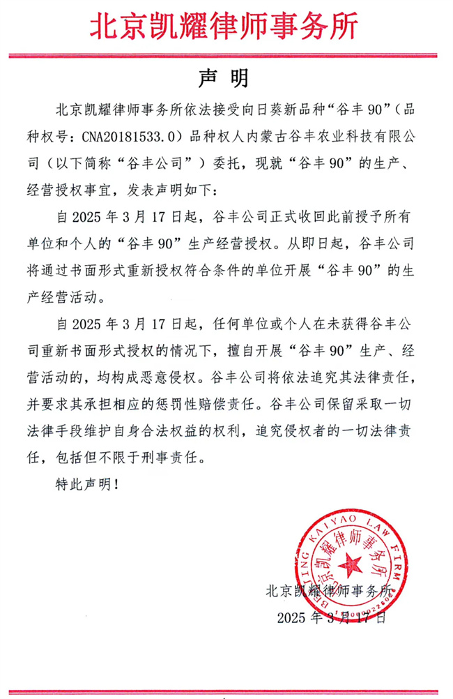 北京凯耀律师事务所依法接受向日葵新品种“谷丰90”(品种权号:CNA20181533.0)品种权人内蒙古谷丰农业科技有限公司(以下简称“谷丰公司”)委托,现就“谷丰90”的生产、经营授权事宜,发表声明如下: