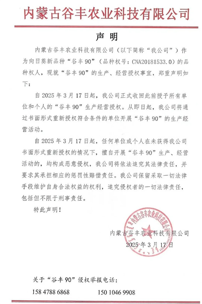 内蒙古谷丰农业科技有限公司(以下简称“我公司”)作为向日葵新品种“谷丰90”(品种权号:CNA20181533.0)的品种权人,现就“谷丰90”的生产、经营授权事宜,郑重声明如下: