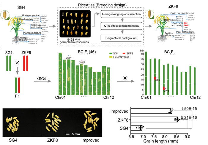 科研团队对我国五大主要稻区的6044份现代水稻品种进行深度全基因组重测序,结合五大稻区19个鉴定点212组表型数据,系统阐明了不同稻区水稻品种基因组和表型选择特征,多维度揭示了不同稻区品种适应性以及人文选择影响。根据以上数据,鉴定到3131个与抽穗期、产量以及逆境响应等关键农艺性状显著相关的位点,并克隆到水稻粒形调控新基因OsGL3.6。进一步结合已发表数据,完成了近万份水稻资源、品种的高密度变异图谱的构建,并开发出在线育种辅助工具,打造了全球最大的水稻资源育种综合数据平台——RiceAtlas,科研人员利用该平台快速改良“绥粳4号”水稻粒形。该项研究为水稻精准设计育种的智能决策提供了重要理论依据和数据支撑。