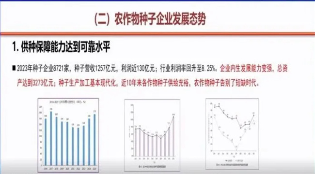 2023年,种子企业8721家,种子营收1257亿元,利润近130亿元,行业利润率回升至8.25%。企业内生发展能力变强,总资产达到3273亿元,种子生产加工基本现代化。近10年来各作物种子供给充裕,农作物种子告别短缺时代。