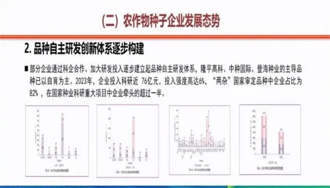 部分企业通过科企合作、加大研发投入,逐步建立品种自主研发体系。隆平高科、中种国际、登海种业的主导品种已以自育为主。2023年,企业投入科研近76亿元,投入强度高达6%,“两杂”国家审定品种中企业占比为82%,在国家种业科研重大项目中企业牵头的超过一半。