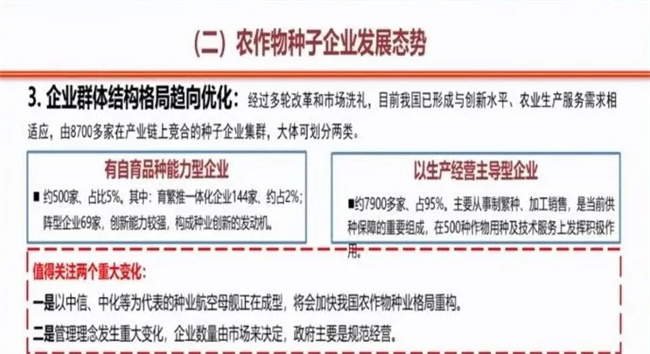 1.有自育品种能力型企业:约500家,占比5%;育繁推一体化企业144家,约占2%;阵型企业69家,创新能力较强,构成种业创新的发动机。