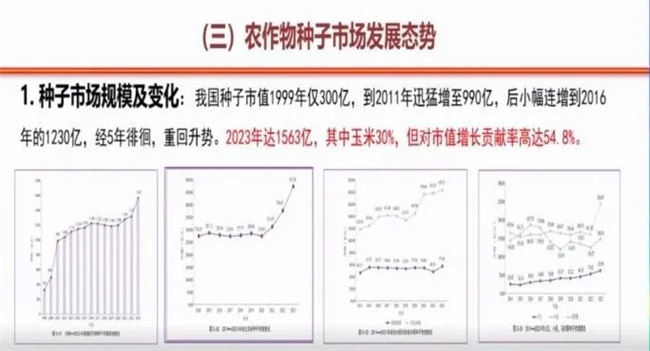 我国种子市值1999年仅300亿,到2011年迅猛增至990亿,后小幅连增到2016年的1230亿,经5年徘徊,重回升势。2023年达1563亿,其中玉米占30%,但对市值增长贡献率高达54.8%。