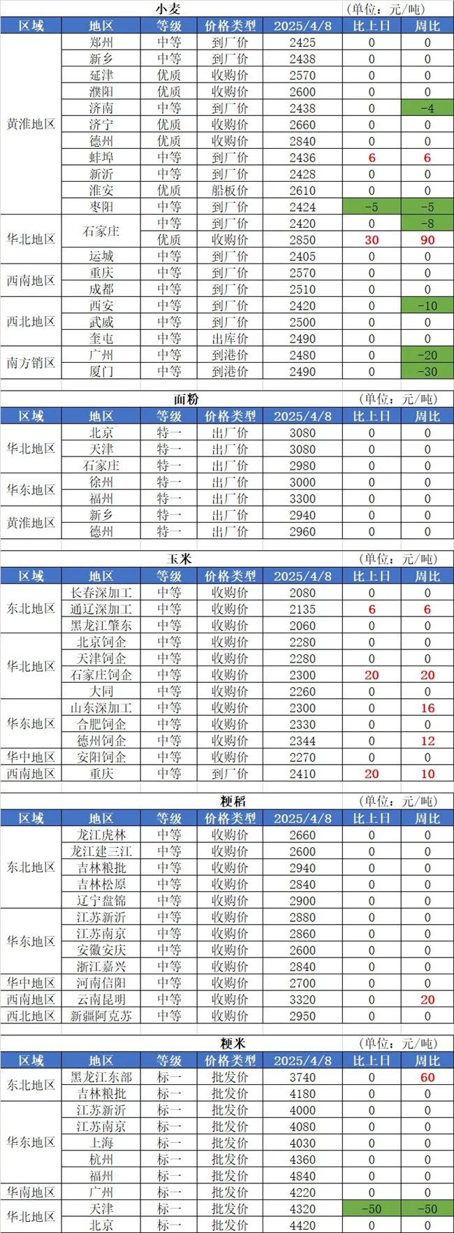 1、4月8日,小麦价格稳中偏弱调整。其中,天邦粮油跌5厘,含票1.212元/斤;雄县好面缘跌4厘,含票1.21元/斤;周口五得利跌3厘,含票1.217元/斤;涡阳金沙河涨3厘,含票1.218元/斤。