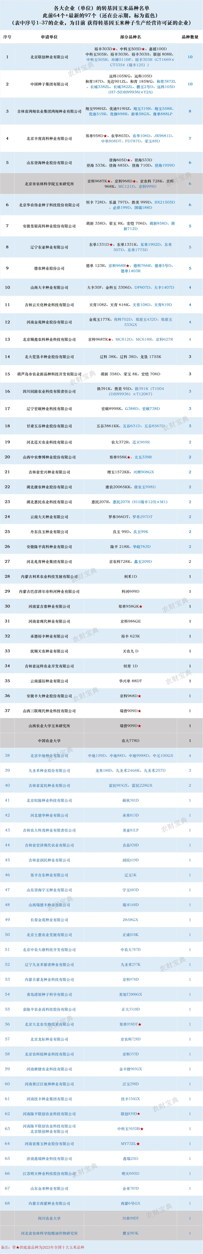 在上述品种名单中,可以看到,国内主要的玉米大单品已陆续推出转基因版本,在2023年全国推广面积位居前十的玉米品种,已有9个推出转基因版本,在当年推广面积全国第一的“MY73”的升级版“MY73ZL”拟通过国审。郑单958、京科968、裕丰303、中科玉505等经典品种已推出多个升级版。