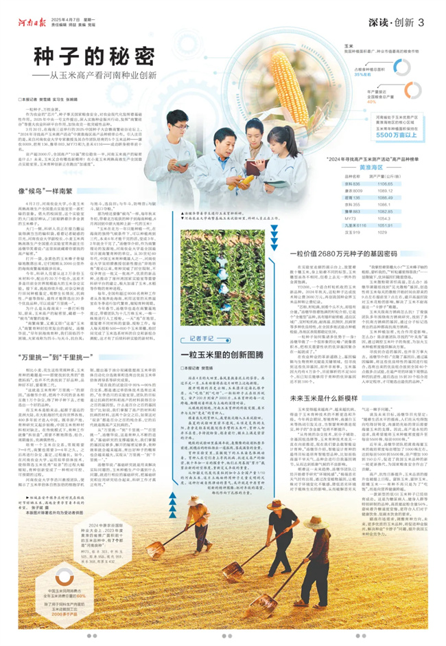 编者按:在南海之滨的热风中,在河南农大的试验田里,一群“育种人”奔波如候鸟,只为育出一粒更强壮、更高产的玉米种子。2025中国种子大会上,河南农业大学科研团队培育的5个玉米品种跻身全国高产“十强”,背后是对粮食安全的执念、对科研的坚守。从“万里挑一”到“千里挑一”,从田埂到实验室,他们用时间和智慧,描绘未来玉米的模样,也回答着“谁来养活中国”的时代命题。今日《河南日报》整版聚焦,致敬埋头种地、心怀热土的河南农大育种人。