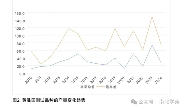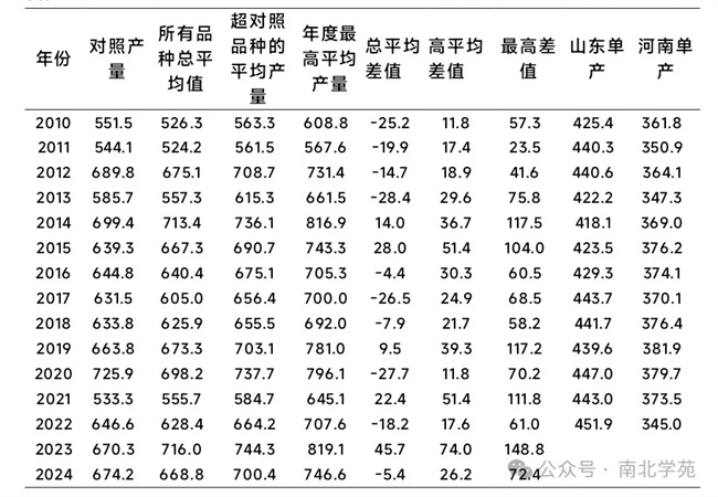 对 2010 年至 2024 年各单位选育的测试组合在 15 年期间的产量变化趋势进行产量统计(表1),其中表中的高平均差值表示的是所有超过对照的品种的产量平均值与对照产量的差值,最高差值是当年平均产量最高的品种产量与对照产量的差值。
