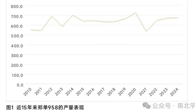 从统计来看,对照郑单 958 在黄淮区年际间产量波动在 533 - 725 公斤/亩左右,波动范围较大,年际间波动范围在 90.3--102.3 公斤。近 15 年的平均产量为 635.6 公斤,2020 年郑单 958 产量是 15 年期间最高的,黄淮区域平均产量为 725.9 公斤,2021 年平均产量低至 533.3 公斤,可能与当年锈病发生较早较重有关。