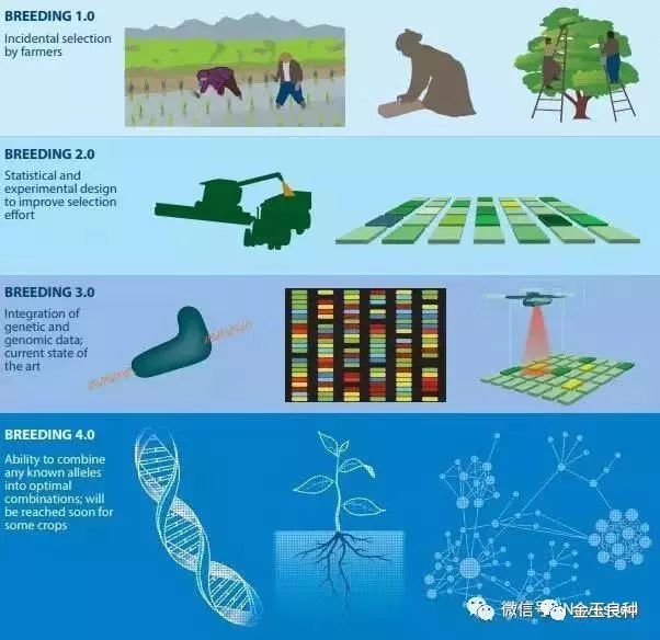 我见到谈及育种史的第二位学者是美国康奈尔大学玉米遗传育种学家、美国科学院院士 Edwards Buckler 教授,在2018 年初提出了“育种4.0”的理念,即作物育种技术的发展伴随人类社会的进步已经历了 3 个标志性阶段,目前正跨入第四个阶段。如图2所示。该学者还在华中农业大学就此进行了专题报告。
