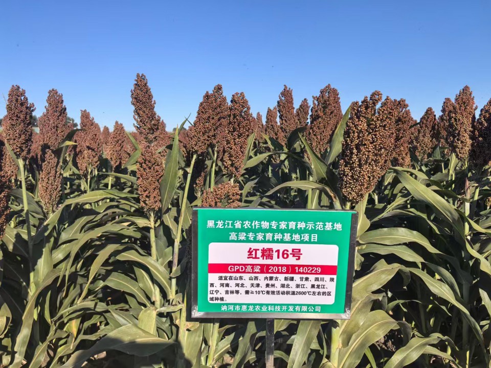 红糯16号高粱种子登记编号: GPD高粱(2018) 140229生育期124天左右,需≥10C有效活动积温2600C左右。幼苗绿色,株高150厘米左右,整齐-致,穗长40厘米左右,长简型中紧穗,千粒重 25克,籽粒红褐色,紫红壳圆粒,成熟时不落粒,脱壳好不留尾。植株繁 茂,生长健壮,叶片深绿色,活秆成熟,秆强不倒伏,抗旱耐涝,适应性较 强,抗逆性好。高抗叶部病害和黑穗病,抗蚜虫。适宜机械化收获。红糯16 号种皮厚,硬度高,玻璃质含量高,糯性好,耐蒸煮,耐翻造,出酒率高。 籽粒含粗淀粉74.42%,其中支链淀粉含量占总淀粉含量的100%,粗蛋白 8. 33%,粗脂肪3. 46%,单宁1. 38%,氨基酸总量8. 35%。是酿造高端白酒和制 造糯性食品的理想原料,同时也深受国外客商的青睐,是一个优秀的糯高粱 出口品种。产量表现 试验平均亩产750 850公斤,比对照品种晋3增产16. 8%。栽培要点 5月上旬播种,亩保苗6000-7000株;施足底肥,拔节前注意追 肥;出苗后及时定苗,及时铲趟管理;注意防虫在蜡熟末期适时收获。适应区域 黑龙江、吉林、内蒙古、辽宁、河北、 山东、河南、山西、四川、贵州、湖南、湖北、甘肃、新疆、江苏、福建、安徽等适应区种植。咨询电话18724616608