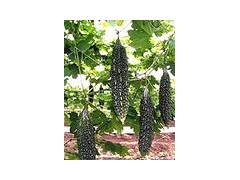 学名脆妃苦瓜. 这种黑苦瓜颜色是墨绿色的,是从台湾地区引进过来的新品种,外形比绿苦瓜长,果肉更厚,瘤状突起鲜明发亮,光泽度极好,关键是这种苦瓜的苦味比普通苦瓜淡得多,果肉也比较厚,口感又十分清脆,而营养和清凉解暑的功效却丝毫不减,大大地迎合了那些既想吃苦瓜又怕苦的消费者.瓜长25厘米左右,果径7厘米左右,平均瓜重500克。普通苦瓜的采摘周期一般在4个月左右,每亩最多产能6000斤,黑苦瓜可高达一万斤.