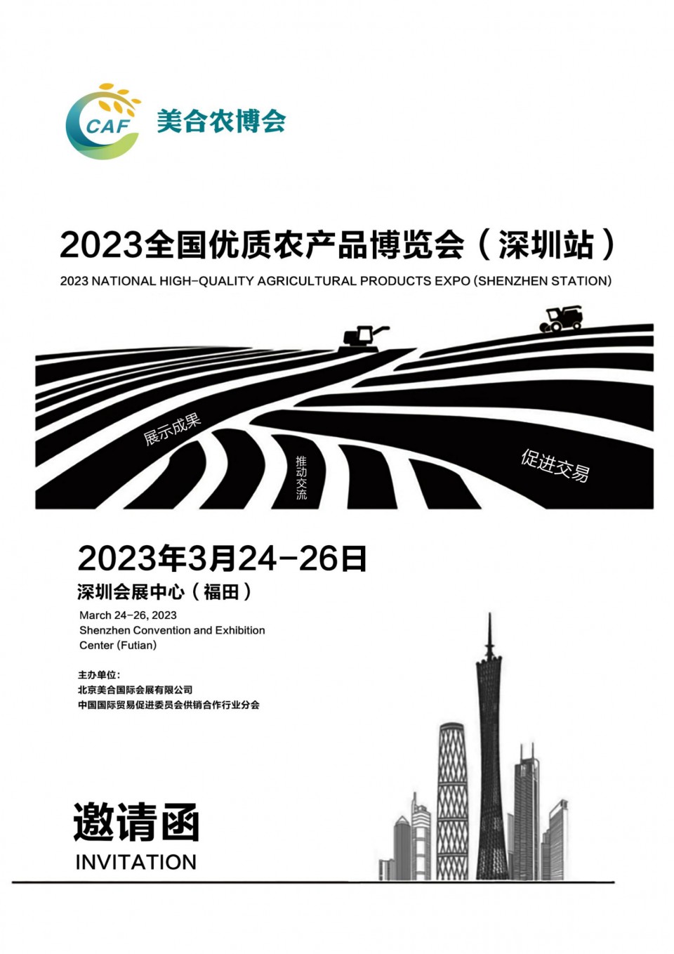 为贯彻落实乡村振兴战略,推进农业品牌建设,搭建产销对接平台,由中国国际贸易促进委员会供销合作行业分会、北京美合国际会展有限公司联合主办的“2023全国优质农产品博览会(深圳)”以下简称“美合深圳农博会”),定于2023年3月24日至26日在深圳会展中心隆重举行。
