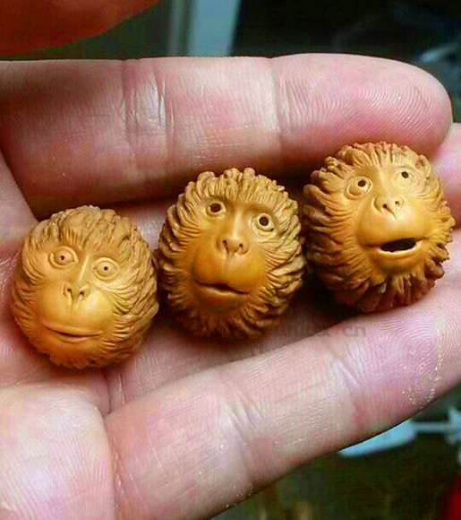 5. 雕刻品用途广泛,“玩法”多样。业内人士通常把核雕品的玩法分为三种(有人称为三种制式),即单个、成对和串活。单个和成对,其实就是大家常说的挂件和摆件;而串活则指的是作为串珠(念珠),制成手串、项串等。对于果个较大、所雕题材内容比较完整的美国猴头核桃雕刻品,可用作挂件或摆件,例如作为手机坠、手包坠、扇子坠、汽车内挂等,或摆于案头欣赏、握于手中把玩。对于果个较小、所雕题材相对简单的美国猴头核桃雕刻品(通常是猴头),当然是制作手串、长串的首选。需要说明的是,除了雕刻外,对于果形圆、果个小、果壳表面纹路美观的美国猴头核桃,就没有必要雕刻了,直接用素珠穿串,即可成为上品;磨光珠穿串也是一种不错的选择。