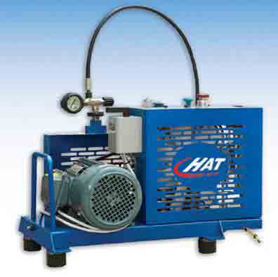 HAT -100 呼吸空气压缩机是一种把压缩气瓶充灌到225 巴或330 巴压力的整套装置。压缩机采用三个汽缸、3级压缩、空冷、往复式活塞压缩机。驱动装置可以采用三相或单相电机。