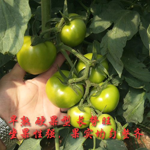 荷兰引进一代杂交种,早熟果硬、无限生长型高硬度粉果,坐果能力强,植株长势旺盛,侧芽少易管理,抗线虫,综合抗病能力性强。节位短,果实大小均匀整齐,高圆形,耐运输;单果重300-350g。转色快,色泽亮丽,无青肩,耐裂果,货架期长,商品性佳。具有抗根结线虫病Mi基因位点、抗番茄化叶病毒病Tm2a基因位点,适合春秋保护地或露地种植。栽培管理同常规,每穗3个果或4个果为宜。 高水肥栽培,肥水充足亩产可达30000斤左右。是当今升级换代的首选高档番茄品种。