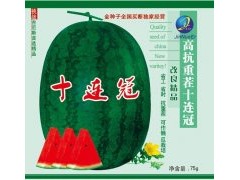 西瓜品种重大突破,高抗枯萎病,重茬多年基本不死苗,是20年来全国瓜农唯一可信赖的品种,是历届挑战吉尼斯大瓜奖的首选唯一品种,经营必富、种植必发,被誉为“金种子”。本品为杂交一代种,表现为抗病高产优质,生长势强,适应性广,易于座瓜,瓜形椭圆,皮色为墨绿皮上镶嵌黑色蛇形花纹。为大果型品种,平均单瓜重20斤以上,最大单瓜可达45公斤以上,亩产一般在13000斤左右。属中熟品种,花后30天成熟,瓤色大红,肉质细嫩多汁,风味独特,清新爽口,中心糖度13度以上,瓜皮坚韧,耐贮、耐运,适合远途销售。本品高抗枯萎病,可抑制炭疽病、病毒病及早晚疫病等发生。