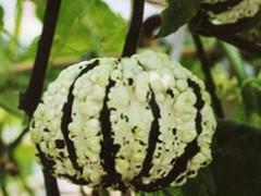 瓜皮。扁球形小果,瓜皮色为绿白条纹相间,像西瓜皮,果径4-6厘米,果高4厘米左右,单果重80克,果肉淡黄色,肉厚1-2厘米,每株挂果5-10个,以主蔓结瓜为主。观赏性强,耐贮存。