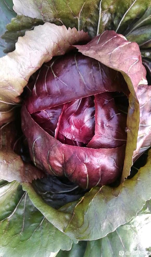 中早熟,移栽后约75天采收,适合冷凉季节栽培,外叶绿色,结球后球内色呈红色,整齐度高。味道微苦,适合凉拌,沙拉食用。