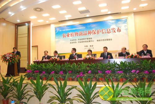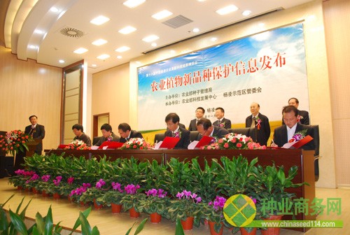 为了进一步宣传我国多年来开展植物新品保护工作的主要成就,鼓励培育和使用植物新品种,加快植物新品种的推广。2011年11月5日下午,由农业部种子管理局主办、农业部科技发展中心和杨凌示范区管委会承办的农业植物新品种信息发布活动在杨凌农高会C馆(国际馆)多功能会议室隆重召开。农业部种子管理局副局长马淑萍,农业部科技发展中心副主任刘平,中国种子协会副会长兼秘书长李立秋,陕西省人民政府副秘书长胡小平,陕西省农业厅副厅长白宜勤,杨凌示范区党工委书记、西北农林科技大学党委副书记梁桂出席。信息发布会由农业部种子管理局品种管理处处长吕波主持。