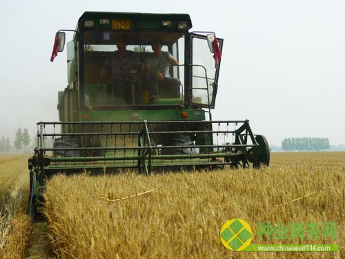 收割机在“百农矮抗58”大田里作业。本网记者 冯建伟 摄