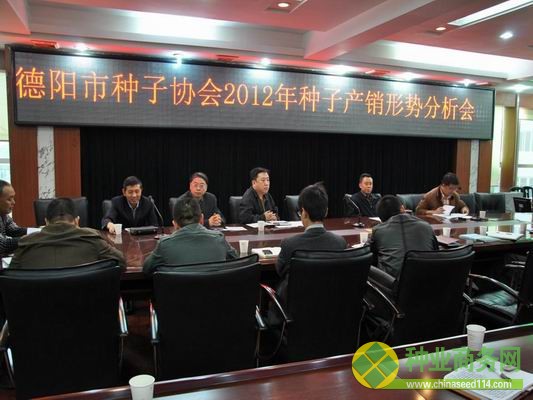 2012年10月10日德阳市种子协会召开2012年种子产销形势分析会;会议分析研讨2012年种子产销形势;商讨种子基地结算原则及种子收购指导价;传达省种子管理站及省种子协会有关会议精神。德阳市农业局局长雍兴文(市种子协会名誉理事长)、市农业局总经济师王孟伟(市种子协会理事长)、市种子协会会员代表、在德阳生产种子企业代表30余人参加会议。(德阳市种子协会)
