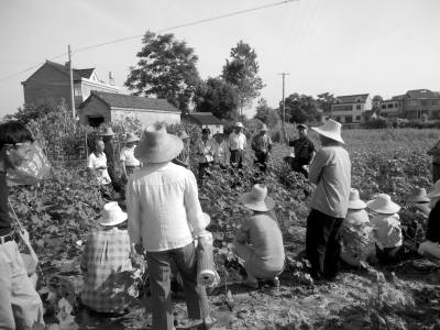 图为安徽省望江县沈冲乡群星村种植的“华杂棉H318”前期长势好,中期遇干旱,7月4日上午,沈冲乡群星村村民聚在一起,听国欣种业专家讲抗旱应变管理技术。