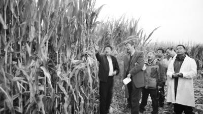 图为登海种业名誉董事长李登海(左一)向中国农科院作物科学研究所作物栽培与生理创新团队首席专家李少昆(左二)等研究员介绍“登海618”品种特性。