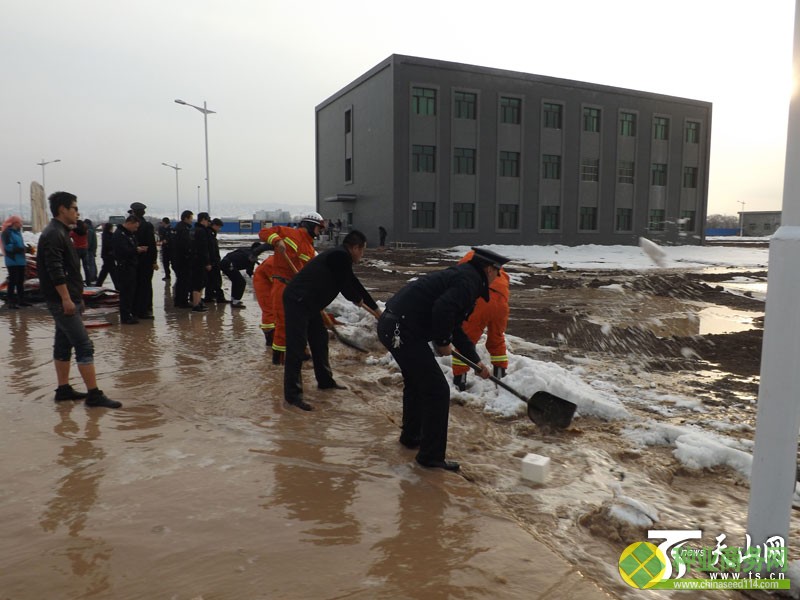 随后,指挥员立即带领战斗员们前往院内对雪水进行堵截。经观察雪水越流越急,并迅速的向北方的厂区蔓延。根据情况指挥员立即命令战斗员拿上铁锹配合挖土机利用泥土对雪水进行堵截,在堵截的过程中不少战士身上被水打湿,衣服沾满了泥点,大家都毫无怨言。经过两个多小时的奋战,军民共同努力将雪水导流至种子公司空地处。