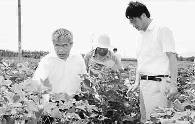 2013年,张献龙(左一)考察长江流域高温对棉花生产的影响。