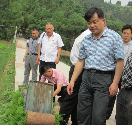 李勇与县农业局、县农办、县水利局、县扶贫移民局等涉农部门负责人一道参观了四川蜀兴种业等企业在涪西镇四方村、凤凰村的1100多亩水稻制种机插秧现场。李勇说:“农机农艺相结合,提升了农业生产效率,解决了谁来种地的问题,水稻制种基地的大规模土地流转,全程机械化的生产模式,不仅让制种公司取得了良好效益,也对周边农民起到了带头示范的效应,促进了全县制种产业的发展。”