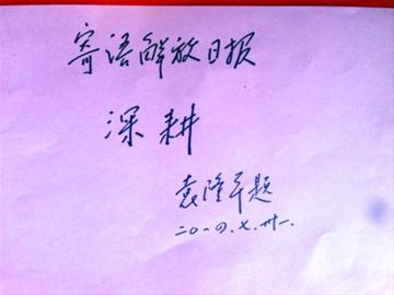 记者特赴长沙采访,袁隆平欣然寄语解放日报。