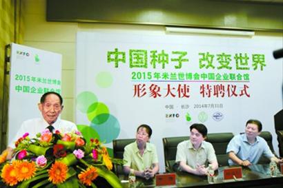 日前在湖南长沙国家杂交水稻工程技术研究中心,袁隆平接过“2015年米兰世博会中国企业联合馆形象大使”特聘证书后发言。
