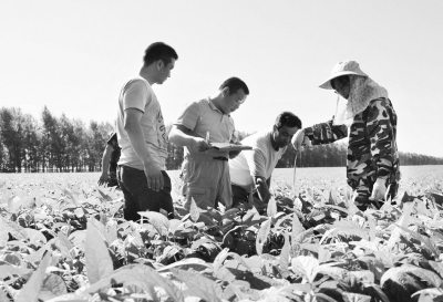 7月26日,北大荒垦丰种业股份有限公司组织检验员对北安局建设农场4000亩大豆种子基地种植的“北豆5”、“北豆10”、“北豆40”三个品种的长势、结荚习性、植株健康情况、保苗株数、杂株率等生长情况进行第2次大豆田间检验,并详细做好了田检记录,为全局明年大豆良种全面推广奠定基础。图为田间检验员在田间检查大豆长势。