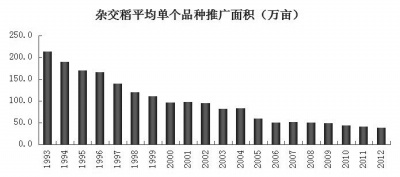 数据显示,近年来,杂交水稻品种下降趋势十分明显,年推广面积100万亩以上的品种数由2002年的46个增加到2004年最高的59个后逐年下降至2012年的29个;年推广面积500万亩以上的品种数由早期的9个左右下降到目前每年1个;从2007年起就未出现过1000万亩以上的品种。杂交稻主要推广品种的单个品种年均推广面积由1993年的213.3万亩,大幅降至2012年的37.4万亩,降幅高达82.5%(见上图)。
