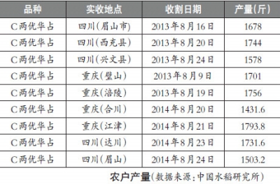 产量表现:2010年参加长江上游中籼组区域试验,平均亩产599.9公斤,比对照Ⅱ优838增产5.4%;2011年续试,平均亩产605.8公斤,比Ⅱ优838增产4.1%;两年区域试验平均亩产602.9公斤,比Ⅱ优838增产4.8%;2012年生产试验,平均亩产619.0公斤,比Ⅱ优838增产7.7%。