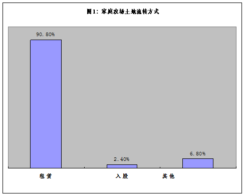 (四)土地流转以租赁为主。在全部被调查的家庭农场中,户均土地流转价格为717元/亩,土地流转方式中90.8%是租赁,2.4%是入股,其他流转方式是6.8%(见图1)。农民土地投资意识不强,新型农业经营主体带动农民致富能力不足。