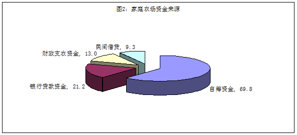(五)资金来源呈现多元化。在全部被调查的家庭农场中,自筹资金的比例达69.8%,银行贷款的比例为21.2%,财政支农资金的比例为13.0%,民间借款的比例为9.35(见图2)。新型农业经营主体的资金来源仍以自筹资金为主,已初步具有金融意识。