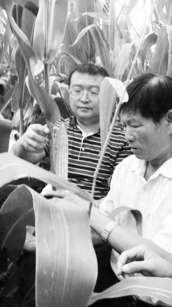 图为北京屯玉种业董事长侯云鹏(左)在农民田里查看屯玉生息品种长势