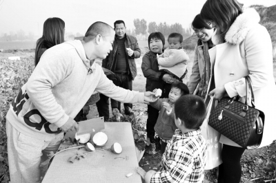11月23日,河南省滑县八里营乡萝卜哥绿色蔬菜种植基地,市民正在采摘品尝水果萝卜。萝卜是滑县“萝卜哥”的拳头产品,因口感好、品质优、无公害备受青睐。随着人们生活水平的提高,水果型萝卜成为新宠。今年,滑县“萝卜哥”钞彦美种植的50亩“天樱”系列水果萝卜喜获丰收。入冬后的水果萝卜,其“水果”特征越发明显,切开生吃,大有晚秋黄梨的口感。小雪过后的星期天,萝卜哥种植基地迎来了一拨又一拨慕名而来的市民和游客。