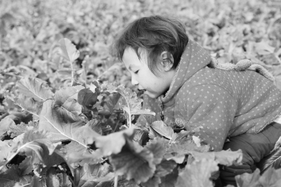 图为基地内一个名叫月月的三岁半小女孩正在用力拔萝卜。