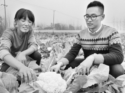 江苏省徐州市铜山区马坡镇依托本地传统蔬菜种植优势,大力促进蔬菜产业化发展,菜农们采用有机栽培管理和病虫害综合防治技术种植的“有机花菜”亩产达3200公斤左右,一般为2公斤左右一棵,最重的接近4公斤,跟普通花菜相比,这种白梗“有机花菜”单株较大,菜茎细长,花朵紧密,个头较大,口感上比普通花菜更甜更脆。图为即将采收的“有机花菜”。