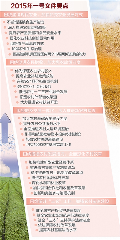 2015年,农业农村工作要全面贯彻落实党的十八大和十八届三中、四中全会精神,以邓小平理论、“三个代表”重要思想、科学发展观为指导,深入贯彻习近平总书记系列重要讲话精神,主动适应经济发展新常态,按照稳粮增收、提质增效、创新驱动的总要求,继续全面深化农村改革,全面推进农村法治建设,推动新型工业化、信息化、城镇化和农业现代化同步发展,努力在提高粮食生产能力上挖掘新潜力,在优化农业结构上开辟新途径,在转变农业发展方式上寻求新突破,在促进农民增收上获得新成效,在建设新农村上迈出新步伐,为经济社会持续健康发展提供有力支撑。