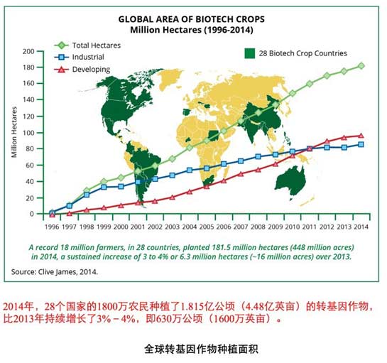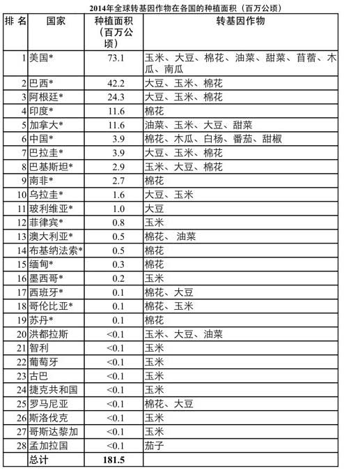 2月1日消息,根据国际农业生物技术应用服务组织(ISAAA)发布的一份报告,2014年全球转基因作物种植面积为创纪录的1.815亿公顷,比 2013年增加了600万公顷。 中国转基因作物种植面积为390万公顷,较2013年下滑30万公顷,仍位于世界第六位。 报告指出随着孟加拉国的加入,2014年共有28个国家种植转基因作物。