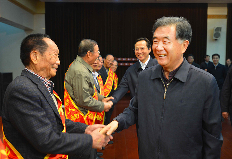 2月9日,国务院副总理汪洋与“中国种业十大功勋人物”和“全国十佳农民”进行座谈,对他们在发展现代农业中作出的突出贡献表示敬意和感谢。图为汪洋与水稻育种学家袁隆平院士亲切握手。 本报记者刘刚摄