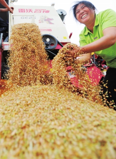 2014年江苏粮食生产实现建国以来连续十一年增产。泰州市姜堰区兴泰镇农民正利用晴好天气抢收丰收的小麦。