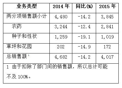 2015年一季度,先正达实现农药销售额28.41亿美元,同比下降12.4%;若按恒定汇率(CER)计,则同比增长1%。